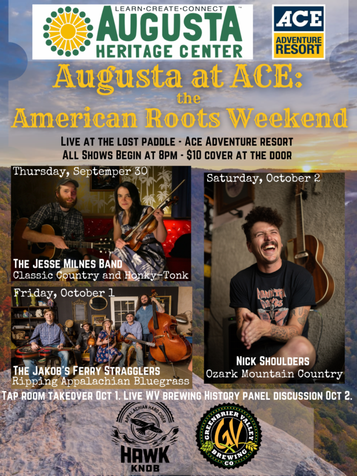 The Augusta Heritage Center presents, Augusta at Ace: The American Roots Weekend Thursday September 30th-Saturday, October 2nd. Live music each night with a Tap Room Takeover on October 1st and a WV Brewing History Panel on October 2nd.